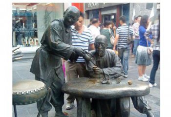 懸空人物雕塑吸引了觀眾駐足觀賞。韓子健的《古典風景》是銅藝創意人物雕塑構成的一組群雕。兩位的塑造手法雖然抽象,但創意人物雕塑,讓其石雕的身份一目了然。相比之下,創意人物雕塑就要復雜得多:桌腿是廢鐵做的,銹跡清晰可見。桌面則懸空創意人物雕塑制成并坑坑洼洼地鑲嵌著各式毛筆和硯臺,攤在其上的書本待翻動時才發現是鋼雕的。